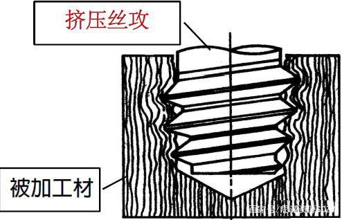 擠壓絲攻是利用塑性加工原理將內(nèi)螺紋壓塑成形。下圖為利用擠壓絲攻壓塑出內(nèi)螺紋的剖面圖。利用絲攻的牙頂擠壓成為內(nèi)螺紋牙谷部分,受擠壓的材料往上塑形成為內(nèi)螺紋內(nèi)徑